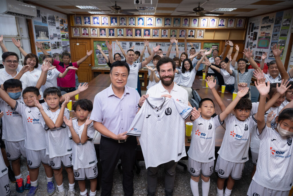 【2025/10/14台北訊】法國電力能源公司旗下「蔚藍海彰化離岸風電計畫」贊助鹿港國小足球隊發展基金,支持彰化優秀球隊健全運作、鼓勵學童全人發展。10月14日於鹿港國小操場辦理足球隊發展基金贊助暨贈衣儀式,在鹿港國小校長龍東湖等貴賓見證下,由蔚藍海彰化離岸風場總監Thomas Hidden代表致贈二套新球衣予球隊42名球員,並與球員互動交流球技,現場氣氛活力四射。